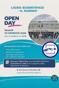 Per presentare l’offerta formativa che caratterizza il nostro Liceo e per visitare le aule e i laboratori, il nostro Liceo organizza l’Open Day il giorno venerdì 23 gennaio 2026 dalle ore 16:00 alle ore 19:00.
